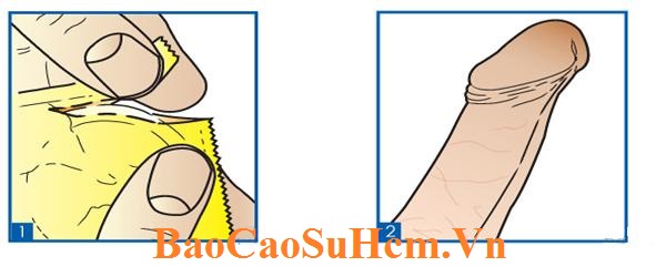 Bước 1: Bạn hãy xé phần bao theo góc khuyết trên đầu bao. Xé bao một cách cẩn thận, không nên dùng kéo hoặc dao để cắt vỏ bao mà nên dùng tay. Chú ý không để móng tay hoặc vật nhọn, sắc cạnh như đồ trang sức đâm vào làm hỏng bao. Trên mỗi bao cao su đều có đường xé giúp chúng ta xé bao ra dễ dàng.