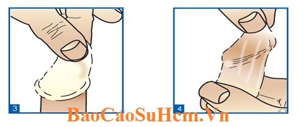 Bước 3 : Kiểm tra mặt bao cuốn phải nằm ngoài dương vật. Chú ý bóp núm của bao cao su không cho không khí còn bên trong khi mang vào. Sau đó đặt bao vào đầu dương vật.