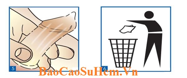 Bước 6 : Không xả bao cao su vào bồn cầu mà bỏ vào thùng rác sau khi thắt nút ở đầu để tránh rò rỉ tinh dịch. Bao cao su chỉ sử dụng 1 lần duy nhất.
